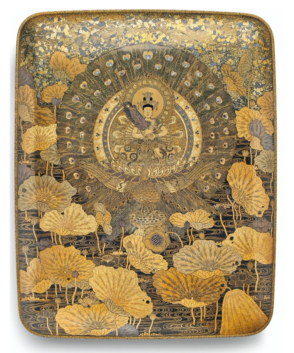 蓮池に孔雀明王が描かれた漆塗り手箱。ペン画のような蒔絵が斬新に見えます。明治時代に作られました。