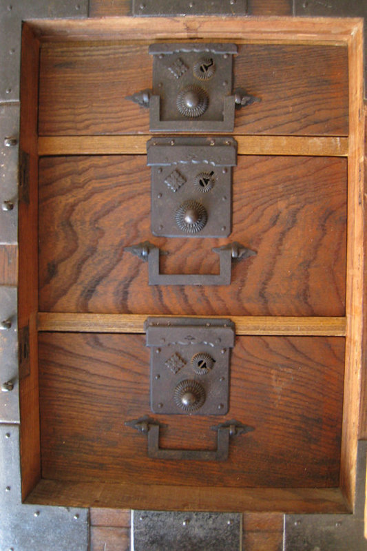 江戸時代の商人が使っていたケヤキの金庫。 ダブルロックで鍵穴が特殊です。③内側の鍵、言うまでもなく頑丈。山形県。Zentner Collection. trocadero.com/stores/zentner…