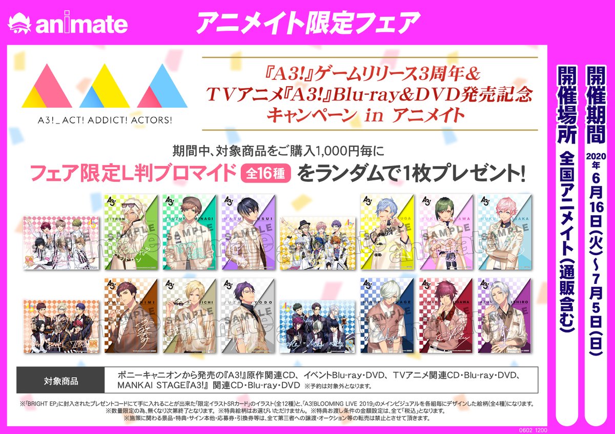 【フェア情報】『A3!』ゲームリリース3周年&TVアニメ『A3!』Blu-ray&DVD発売記念キャンペーン in アニメイト が6/16より開催決定ダワー!!! 対象商品をご購入1,000円毎に【フェア限定L判ブロマイド(全16種ランダム)】を1枚プレゼントします♪