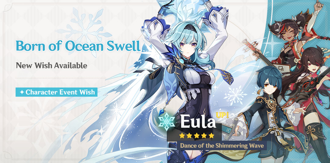 During the event wish, the event-exclusive 5-star character "Dance of the Shimmering Wave" Eula (Cryo) will receive a huge drop-rate boost!