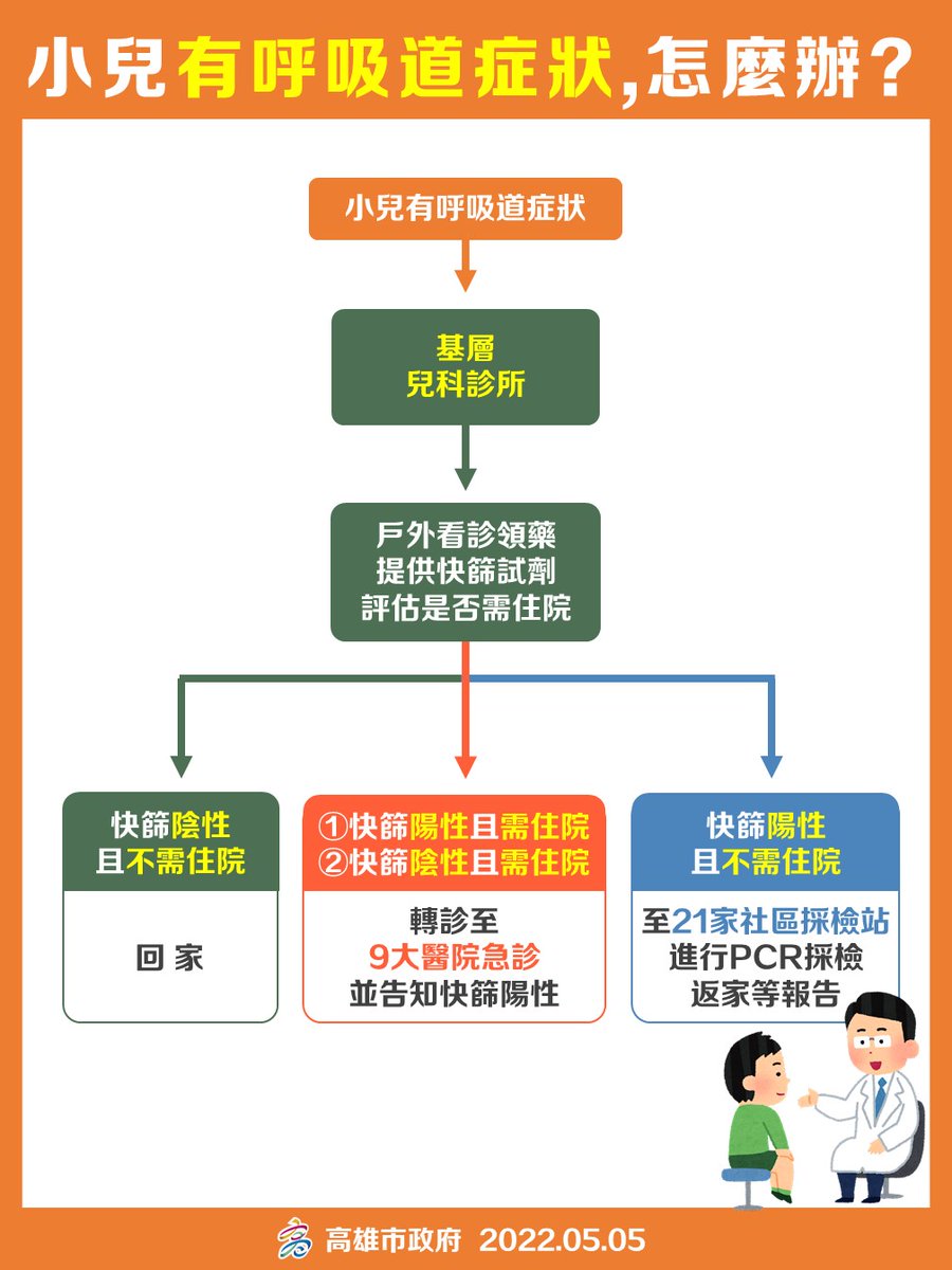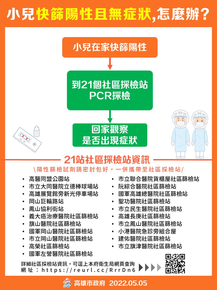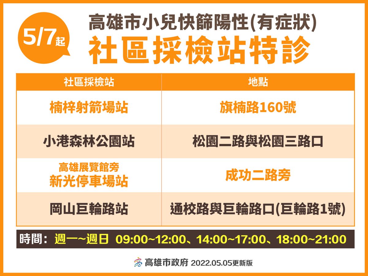 高雄市 5/7 起啟動4家社區採檢站、9家醫院的「#小兒快篩陽性特診」。