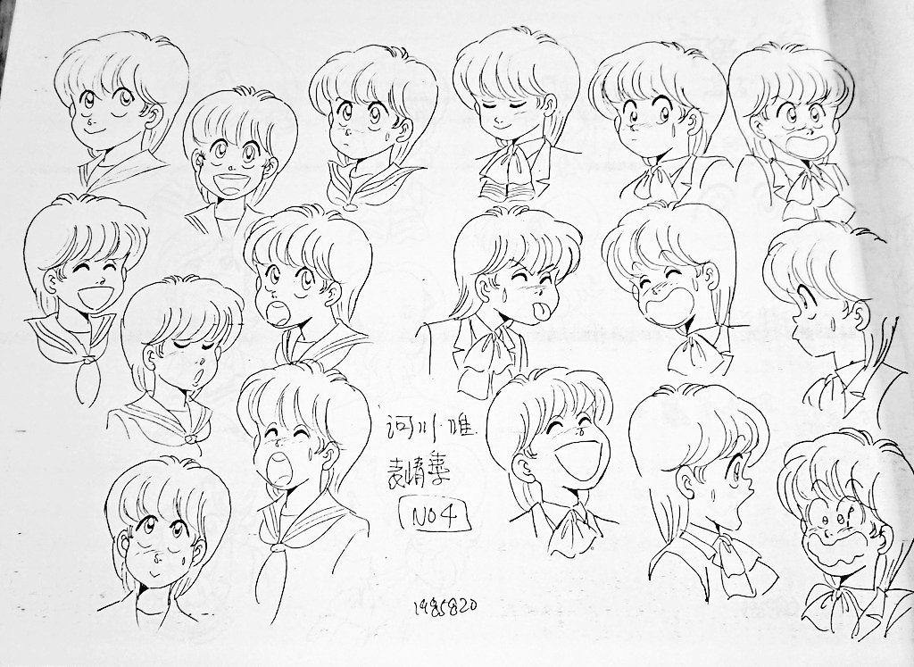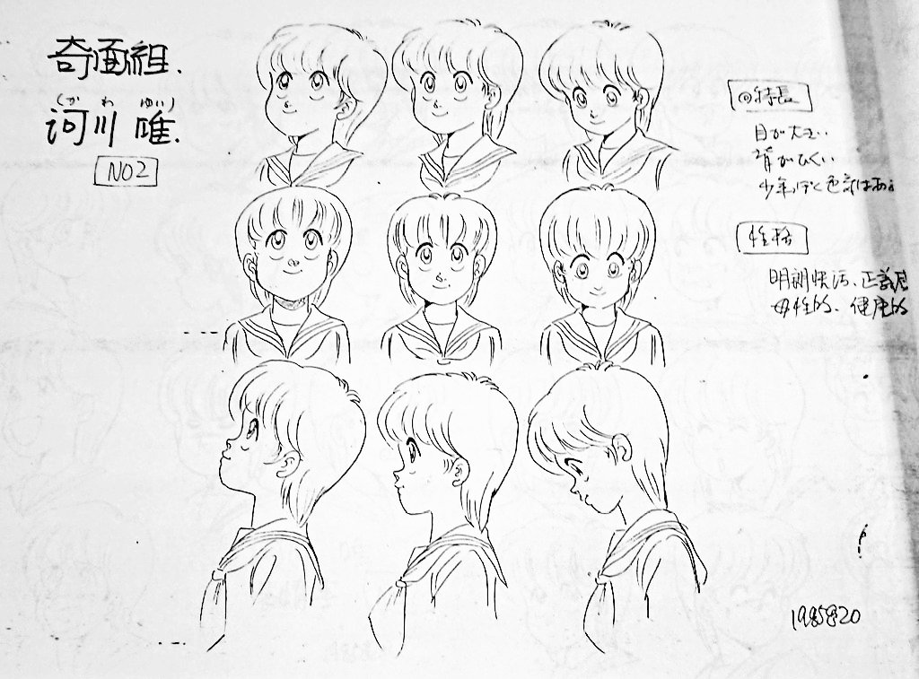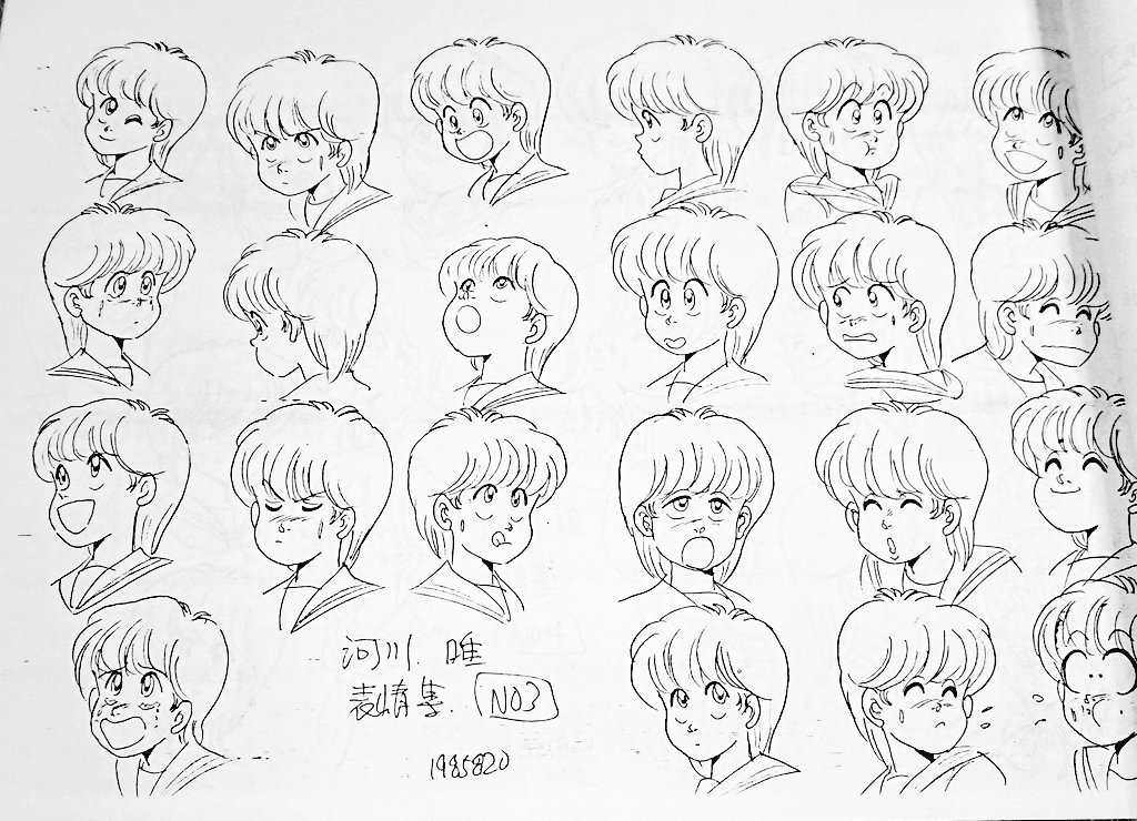 ハイスクール奇面組 設定資料から 河川 唯です 原作者の新沢基栄さんが自ら描かれたもので、表情パターンの多さが知られています