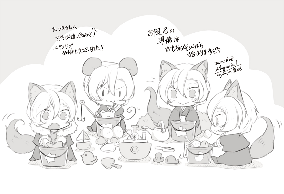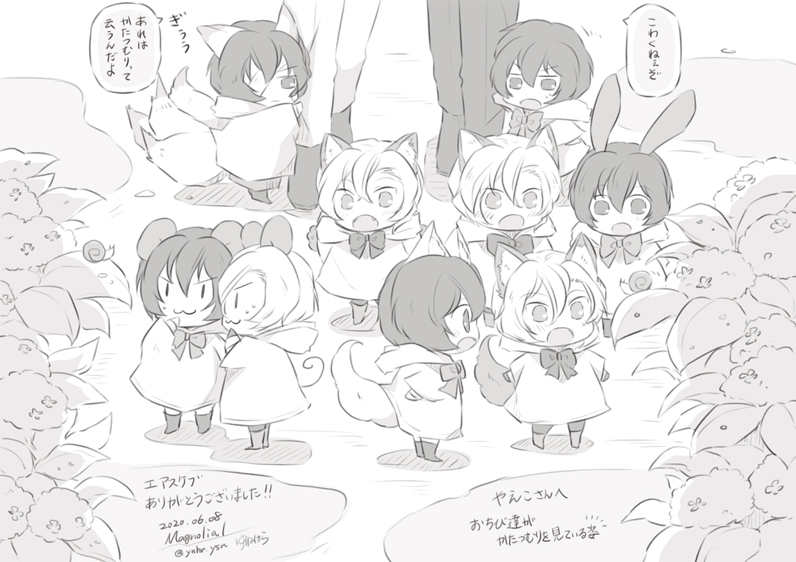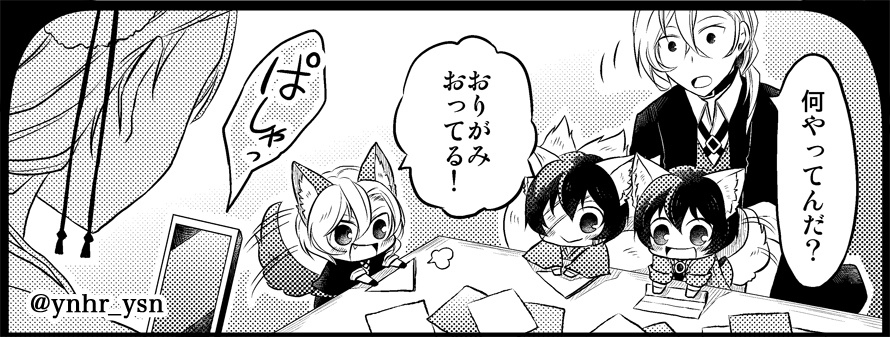 おおかみさんとおきつねさんは🌷、わんこさんは🦀を折ろうとしている図