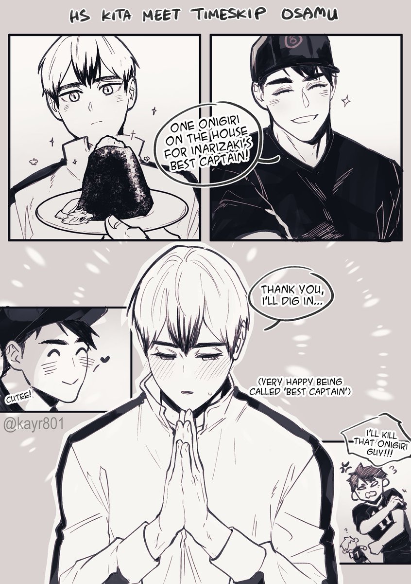 He's Osamu Miya from HAIKYUU!! In the manga after time-skip, he runs an onigiri restaurant called [Onigiri Miya] and for your pleasure, he has a canon twin brother, Atsumu Miya, a professional volleyball player.