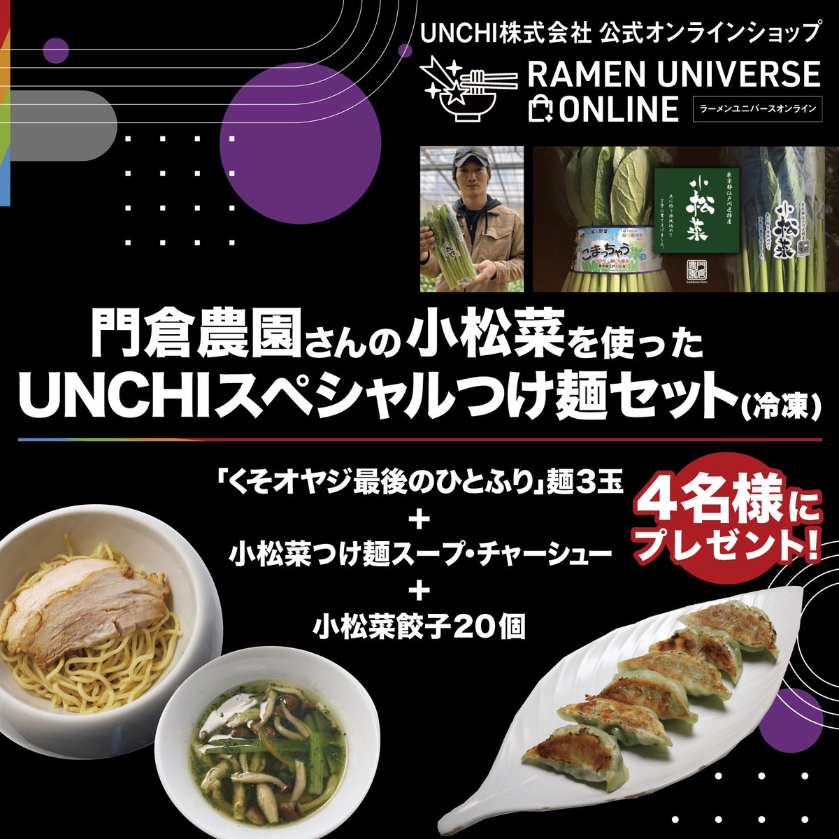 門倉農園さんの小松菜を使ったUNCHIスペシャルつけ麺セットを4名様にプレゼント!