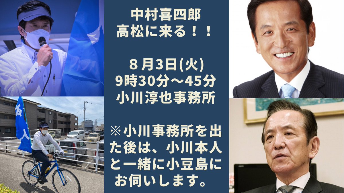 明日(8/3)は関係者全員コロナの検査を行った上で、小豆島に伺います。中村喜四郎議員と一緒に島内2か所で #青空対話集会 を行います