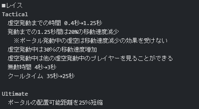 APEXパッチノート:キャラ編 パッシブがほぼリワーク ・ライフライン buff ・オクタン ・レヴナント ・クリプト ・ミラージュ ・ライフライン nerf ・ジブラルタル ・コースティック ・レイス buff/nerf 両方有 ・ローバ ・ワットソン