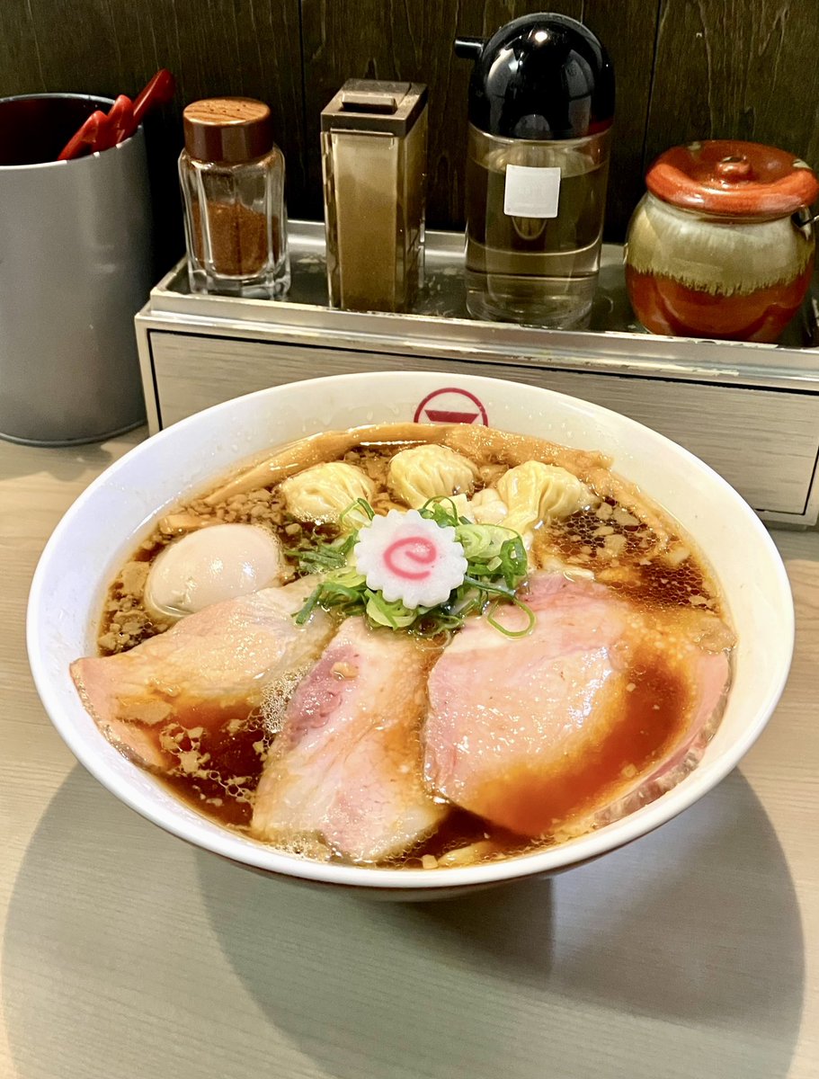 横浜中華そば 維新商店 - 横浜   半年ぶり😋生姜の効いた 力強い醤油の旨すぎスープに 自家製平打縮れのピロピロ麺🍜 スモーキーチャー🥩🥩🥩 🍥&穂先メンマ&味玉🥚くん ジューシーテルテルワンタン最&高("Ü") 💕   はーい🙋‍♀️ 激ウマくーん🎉🎊🏆✨✨   あみちゃんKK オメデト(*ˊᵕˋ*)㊗️