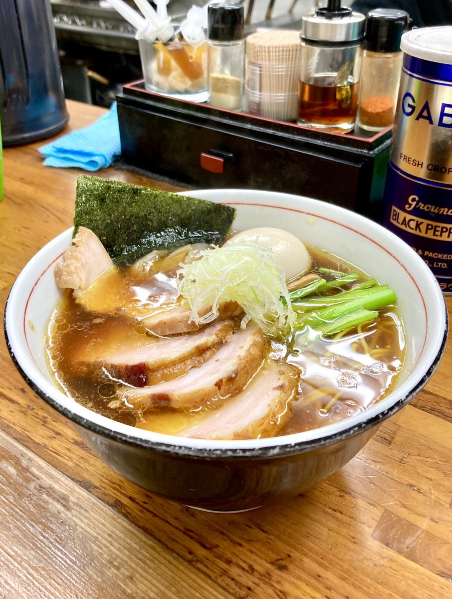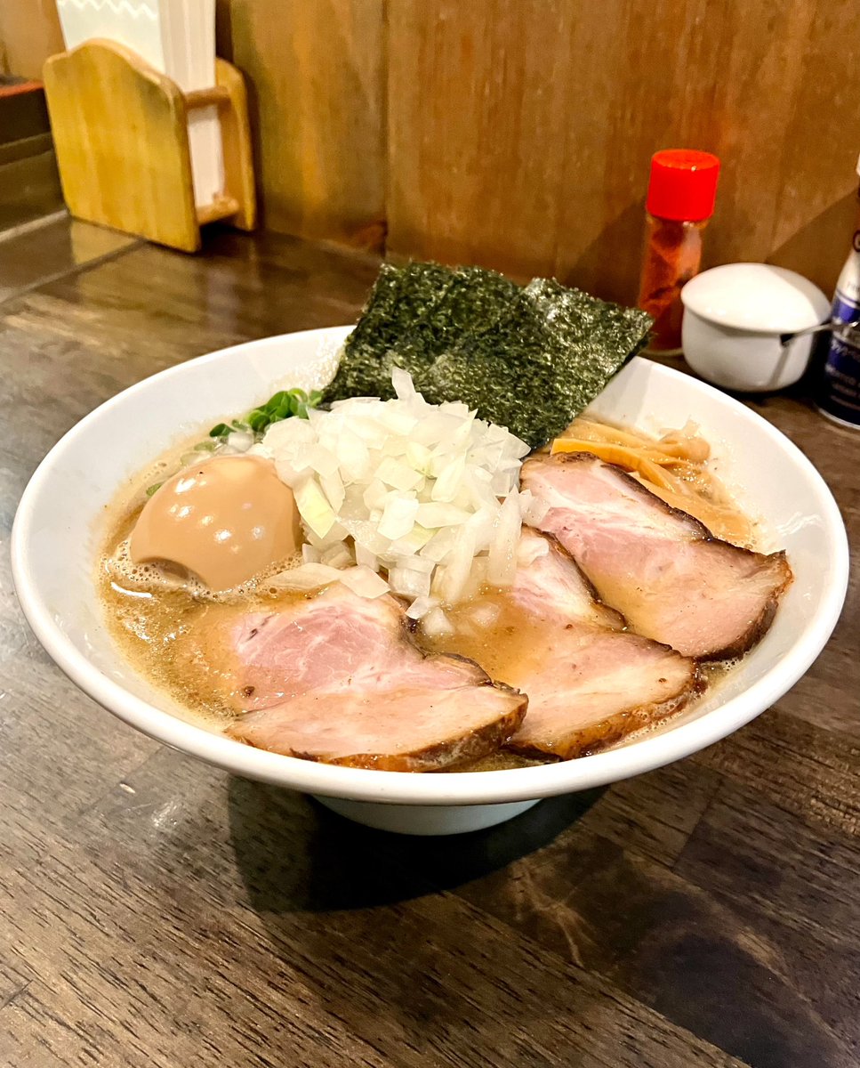 吉田食堂 - 鶴見   特製中華そば🍜900円   ニボニボ🐟トントン🐷 fusion👉👈スープ(º﹃º)ෆ⃛💘   パッツン麺🍜 チャーシュー🥩🥩🥩 味玉🥚、ネギ、海苔◼️ 、メンマ 全てハイパー⚡️(๑´ڡ`๑)ウマイ💕 AND 刻み玉ねぎ入れ放題‼️   はい🙋‍♀️ 激うまくーん🎉🎊🥇🏆✨   来週4/2(日)で㊗️7周年だよ☝️