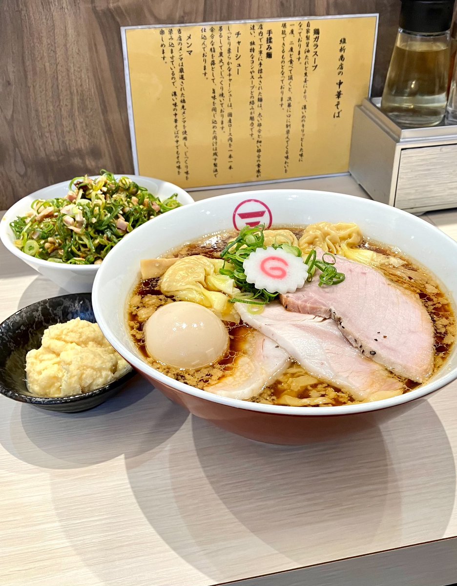 横浜中華そば 維新商店 みなとみらい店🎡   維新商店本店🚗💨到着 厨房設備トラブル臨時休業😵 でも、大丈夫🙆‍♀️ みなとみらい店がある✨   特中華そば(大)🍜葱めし🍚 +追い生姜くん   はい💁‍♀️ うまーーー(ノ*′∀)ノ<ЁЁЁЁЁ‼️   お腹いっぱい 激うまくーん🎉🎊💕✨✨   あみちゃん同麺🍜ありがと👍