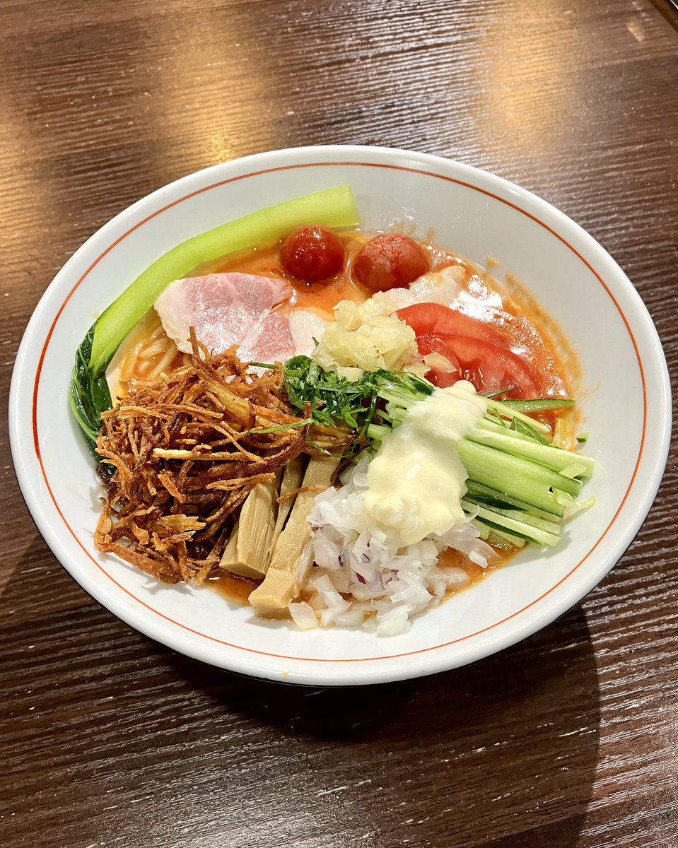 らぁ麺 すみれ堂 - 北山田   限定🍅冷やし トマトラーメン🍜✨ 限定② 950円   視覚に訴える彩り 💚💛🧡❤️最高🙆‍♀️💕   3種のチャーシュー🥩 スライス🍅×3プチ🍅×2 紫玉ねぎ&🥒&小松菜&🧄 🥔フライ&大葉&メンマ   自家製麺と🍜 🍅スープの相性抜群💮 "超"癖になる味で 🙋‍♀️激うまくーん💯🎉🎊✨