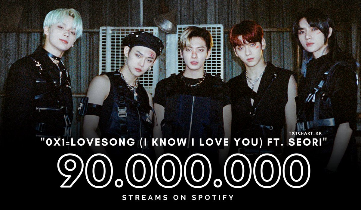 .@TXT_members "0X1=LOVESONG (I Know I Love You) feat Seori" has now surpassed 90,000,000 streams on Spotify. It is now their fastest song to reach this mark (185 days).
