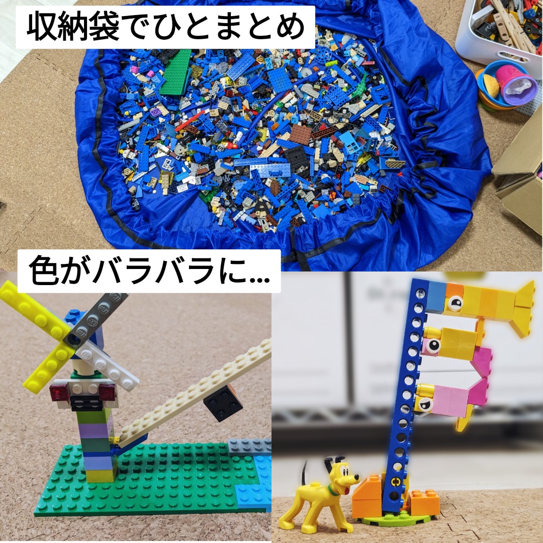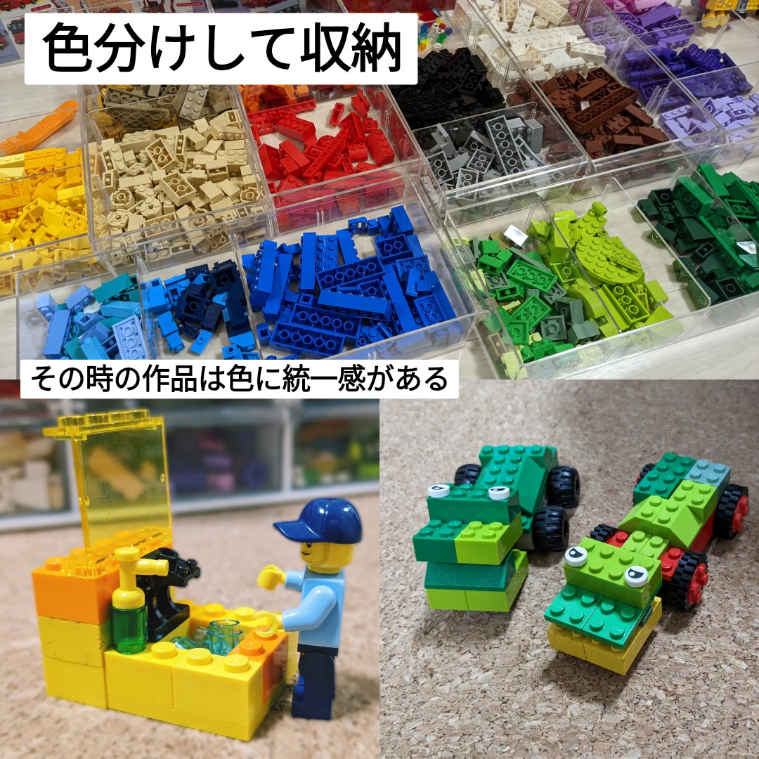 それに対して、全部まとめて収納するようにしたら同じ色を探すことを諦めて適当な色選びをするようになった。(あと、目当ての形が見つからないと親を呼んで探させることも増えた😂)