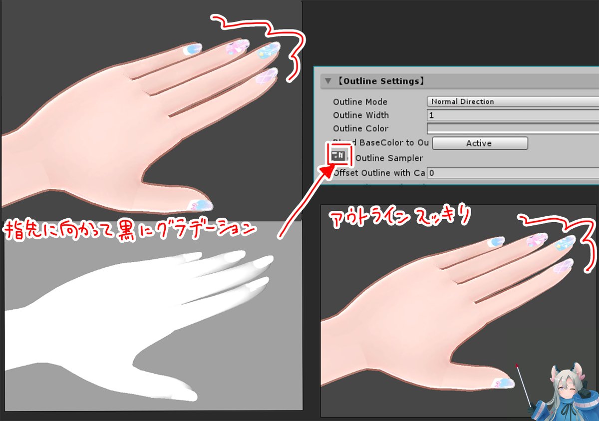 ポリゴン数が少なくてもこのフリップ作業で同じポリゴン数でもシルエットがアウトライン込みできれいに見えます。