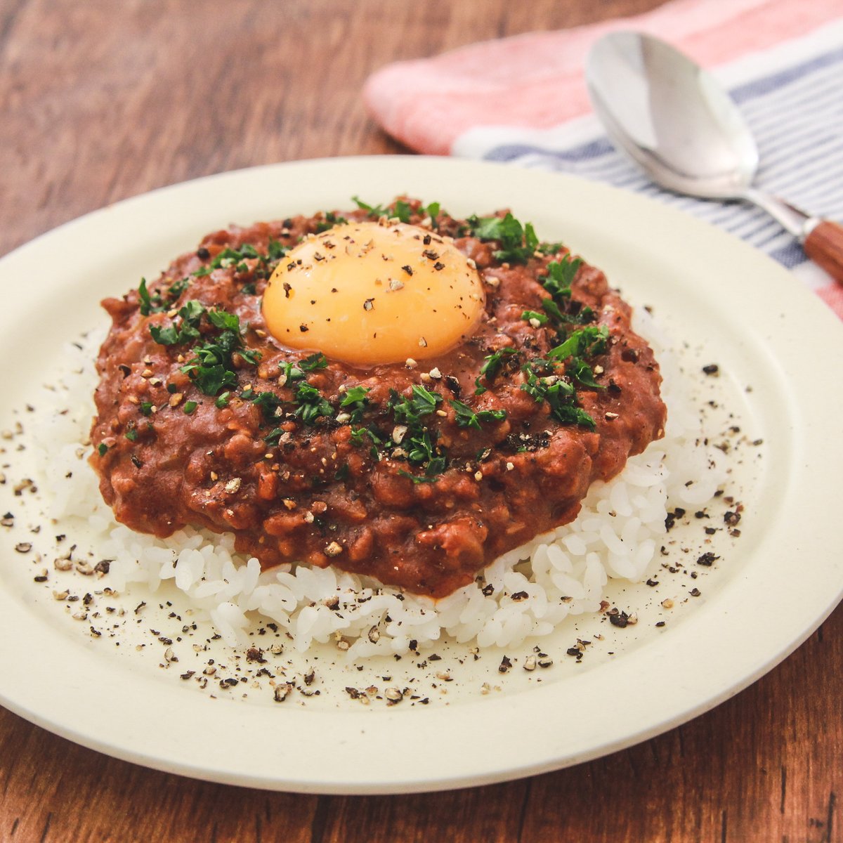週1で食べたくなる。こんなにじっくり煮込んだような本格味がレンジで作れるとは…!って驚かれるキーマカレーです。 玉葱1/2個に酒大1かけ3分チン。合挽肉150g、トマトジュース200g、おろしにんにく小1/2混ぜカレールウ2個のせ10分チン。バター15g混ぜ醤油で調えご飯にかけ卵黄のせパセリ、黒胡椒。