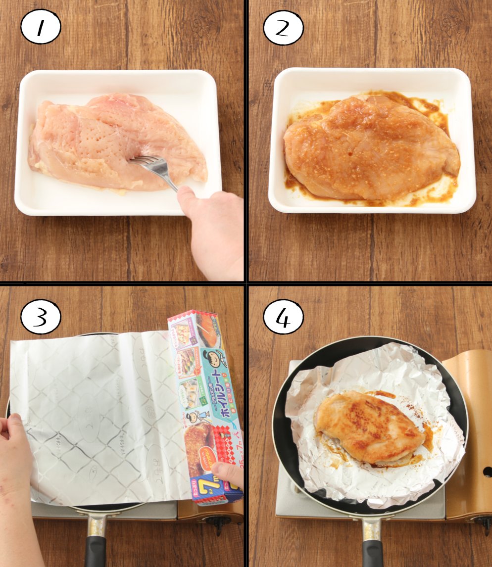 油を引かなくてOK! みそだれのこびりつきなしでこんなにおいしく焼けるの嬉しい…! 【鶏むね肉のジューシーみそ焼き】 鶏むね肉1枚にフォークで穴をあけ、みそ・砂糖各大1、酒・しょうゆ各小1もみ込む。キチントさん フライパン用ホイルシート敷いたフライパンにのせ中火で両面焼く。