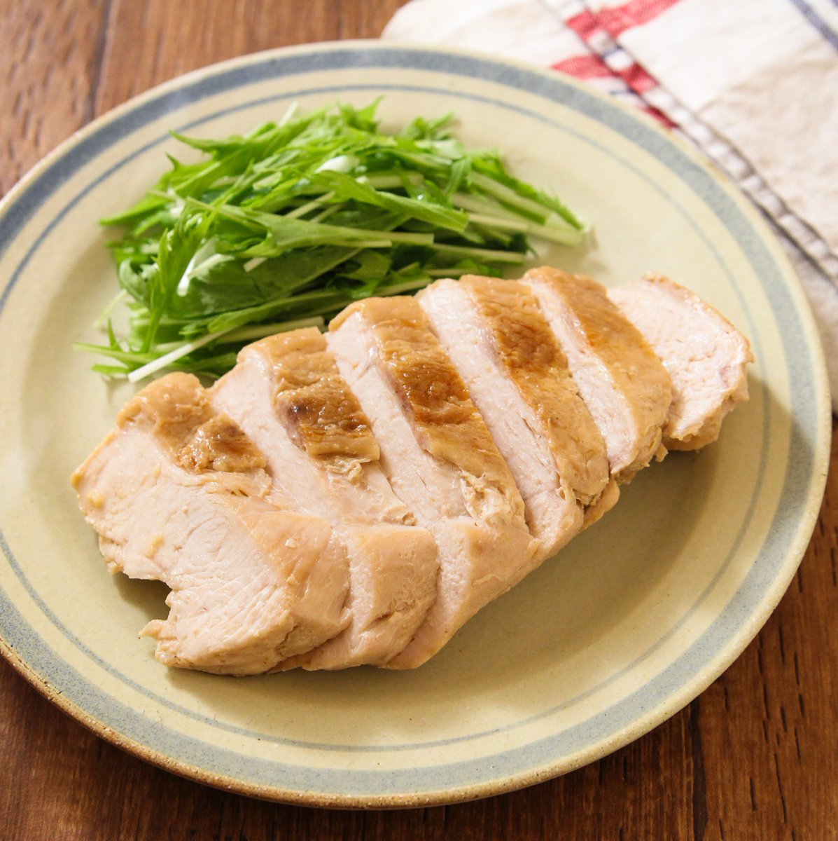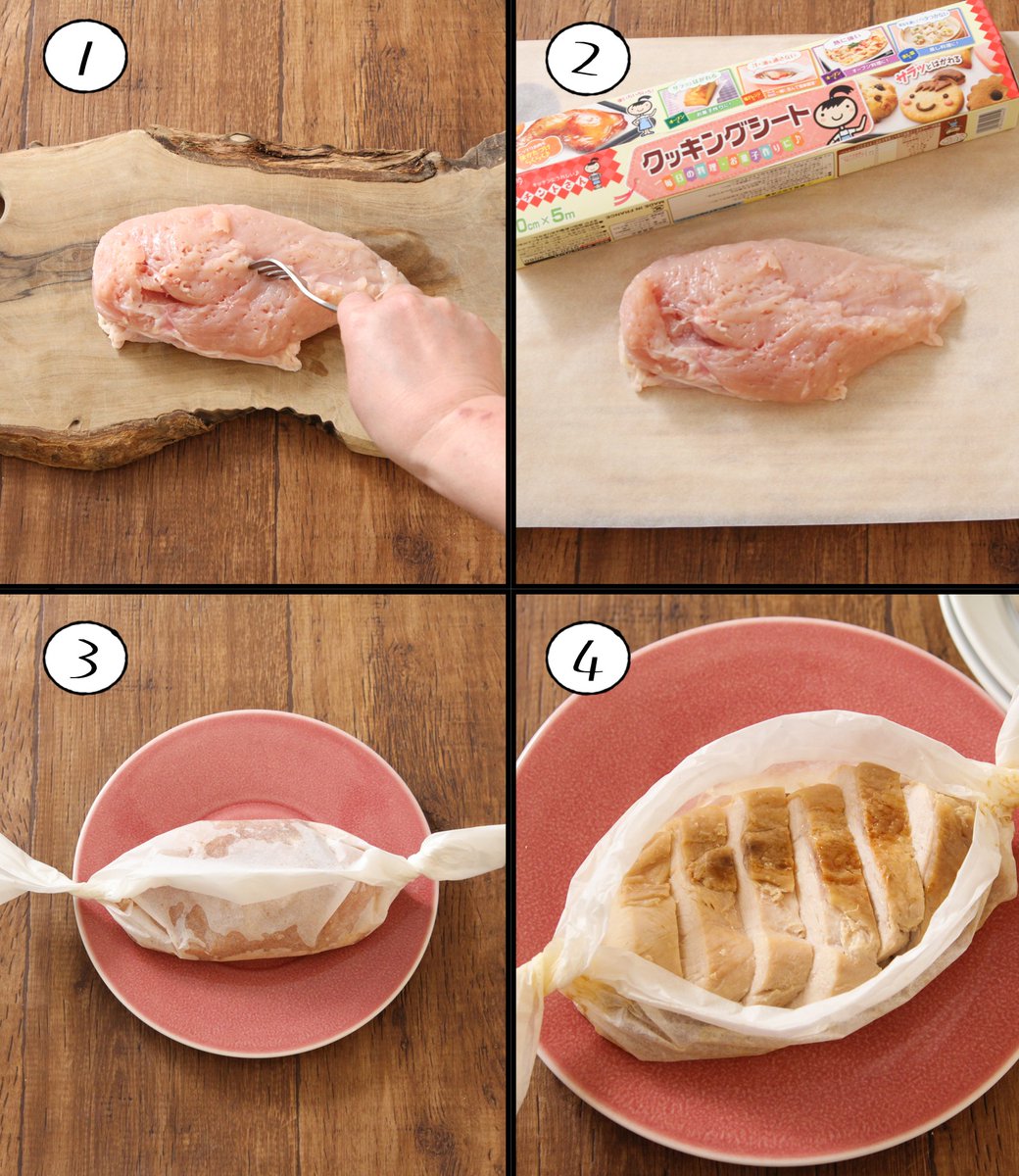 包んでチン!で鶏胸肉がこんなにジューシーになるとは… レンジで【コンソメ醤油サラダチキン】 コンソメ×醤油でまちがいないおいしさです◎ キチントさん クッキングシートに鶏肉300gをのせコンソメ小1、醤油大1/2、おろしにんにく小1/2を絡めて包み4分レンチンして10分おく。
