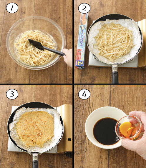 毎日食べたくなるサクホクやみつきの【ハッシュドポテト】油引かずにこの美味しさは嬉しい。 じゃが芋300gを6分チンし粗く潰し、バター10g、ピザ用チーズ40g、鶏ガラ・醤油各小1/2、片栗粉大2混ぜ4等分し小判型に。キチントさんフライパン用ホイルシートを敷き中火で熱したフライパンで焼き塩胡椒ふる