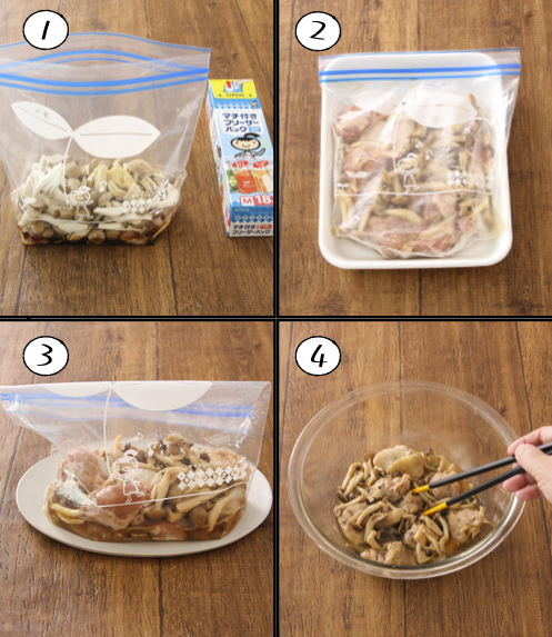 下味冷凍しておけば忙しい時にほんと助かる。旨みじんわり。 ご飯進む味です。 【鶏としめじのうま煮】 キチントさんマチ付きフリーザーバッグに鶏肉300g、しめじ1株、麺つゆ大2、ごま油大1/2、鶏ガラ・おろし生姜各小1混ぜ冷凍。ジッパーの一部開けレンジ解凍し耐熱ボウルに移し10分チン。