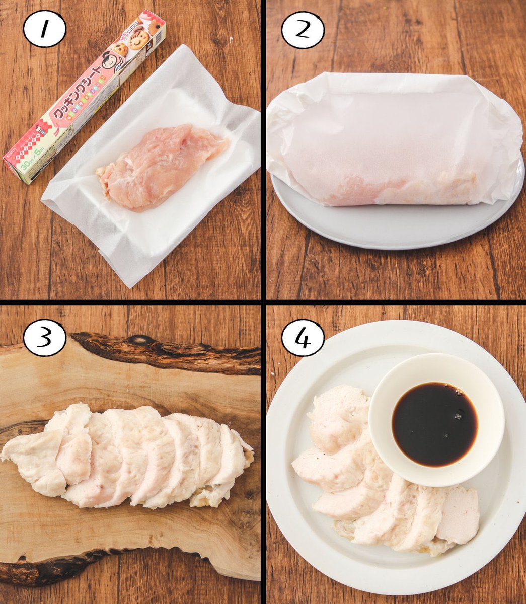 鶏むね肉がこんなにしっとりジューシーになるとは...!って驚かれる【蒸し鶏】 レンジ4分で作れます。 たれはポン酢、ごまだれなどお好みで! キチントさんクッキングシートに鶏むね肉300gをのせ片栗粉小1をまぶし、酒小1、砂糖小1/3、塩小1/4を絡めて包み4分チンして10分おく。