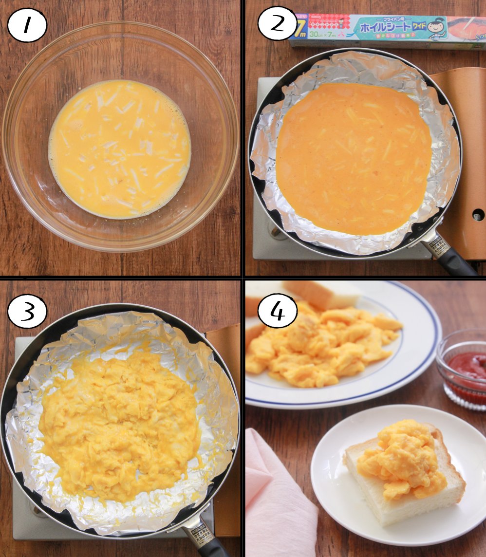 スクランブルエッグはチーズ入れるのが最高では…このとろっとろ濃厚なのを食パンにのせて食べるのが美味しい。 大さじ2の牛乳でとろとろに。 卵3個溶き、牛乳大2、ピザ用チーズ30g、塩胡椒混ぜ、キチントさんフライパン用ホイルシート敷いたフライパンに流し入れ、半熟になったら火を止める。