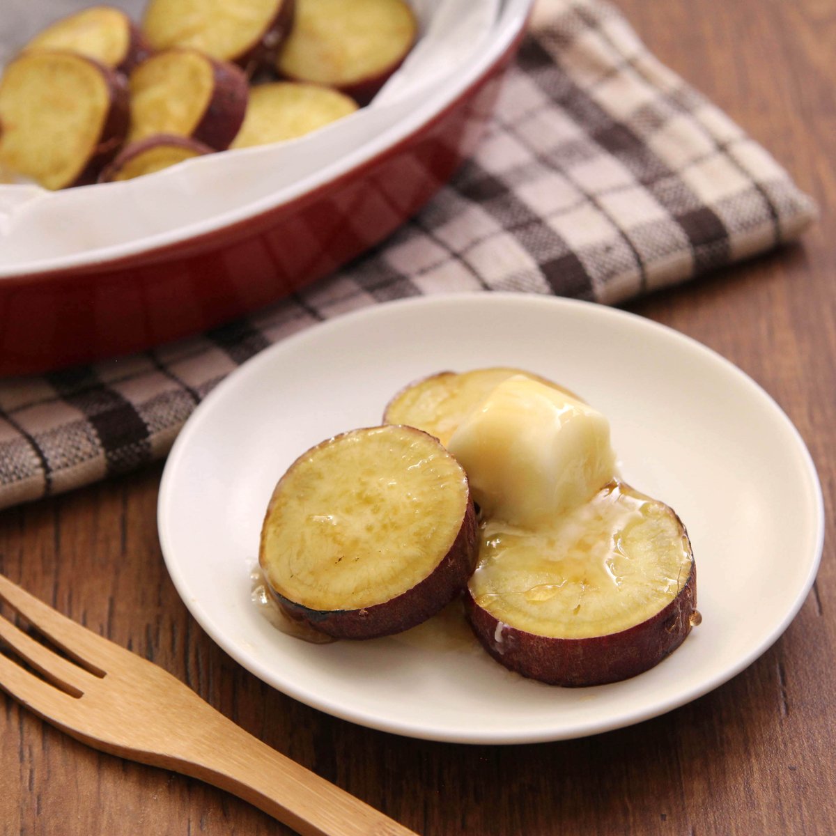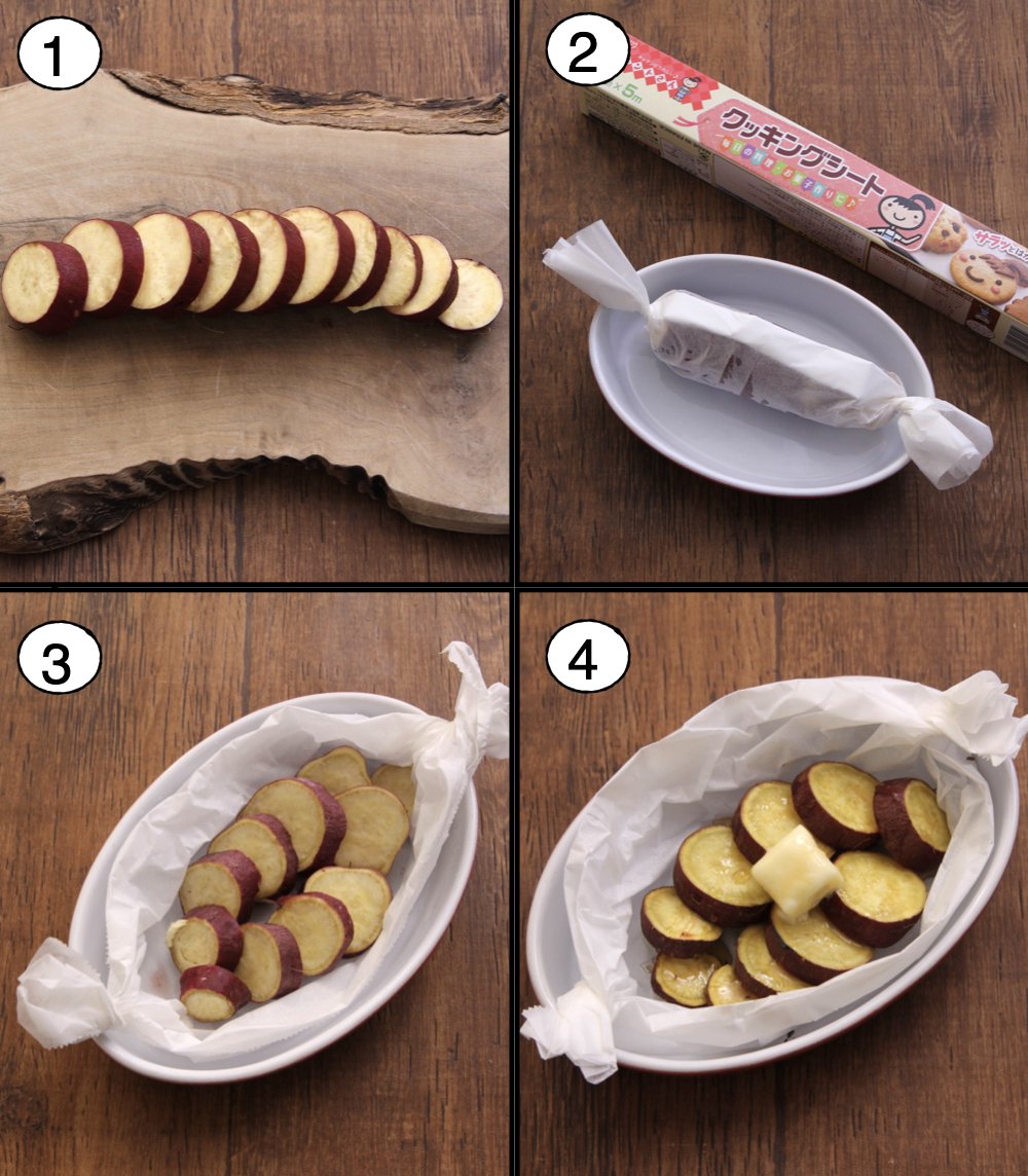 レンジでチン!でパサつきなし。 このしっとりなさつま芋にバター、蜂蜜トッピングするのが最高に美味しい。 スイートポテト食べてる気分で味わえます。 耐熱皿にキチントさんクッキングシート敷き、さつま芋100gのせ水大1かけ包み、5分チン。バター10gのせ蜂蜜大1/2かける。