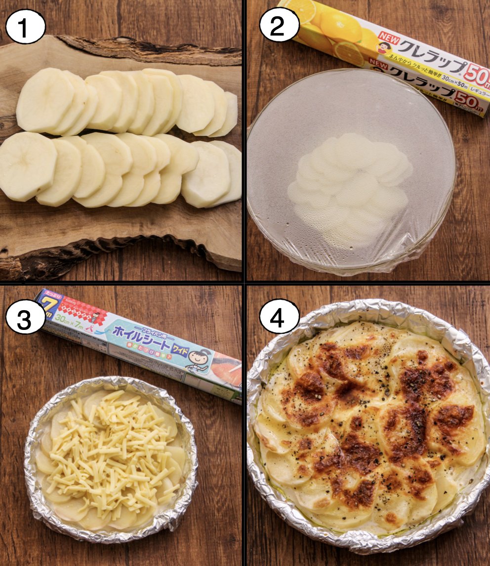 ホワイトソースなし簡単! じゃが芋だけでここまで美味しいグラタンできるとは…って驚く美味しさのグラタンです。「コンソメ+醤油」で深みのある味作れます。 キチントさん フライパン用ホイルシート使えばお皿にこびりつかないから洗い物がラクです。 耐熱ボウルにじゃが芋300g、 続く↓