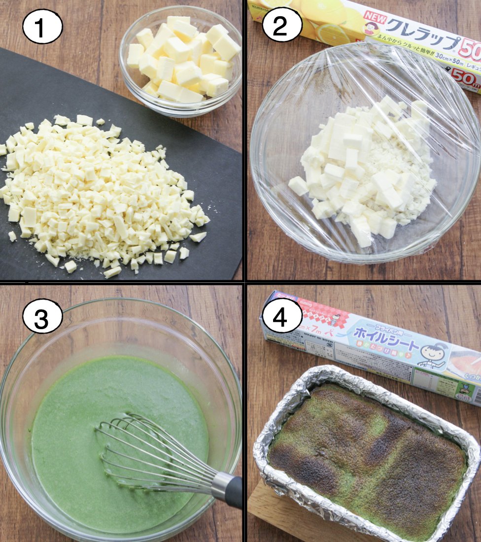 混ぜて焼くだけでこんなに美味しくできるとは…!と驚く【抹茶生ガトーショコラ】 とろ〜り濃厚。カフェの味簡単に作れます。 耐熱ボウルにホワイトチョコ200g、無塩バター150g入れNEWクレラップし2分半チン。溶き卵3個、お湯大2で溶いた抹茶13g、牛乳大2、砂糖大4よく混ぜ 続く▼