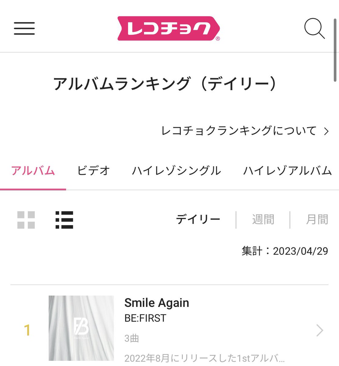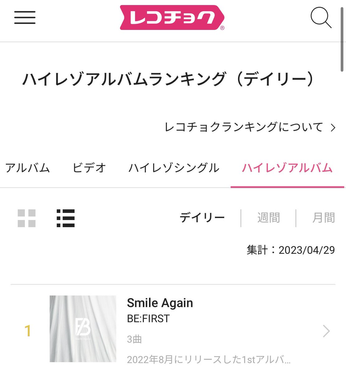 レコチョク🌷.* 4/29 デイリーランキング BE:FIRST 🌞🩵 Smile Again ✈️ シングル 1位🥇 ハイレゾシングル 1位🥇 アルバム 1位🥇 ハイレゾアルバム 1位🥇 (ฅ―ω―ฅ)バンザーイ