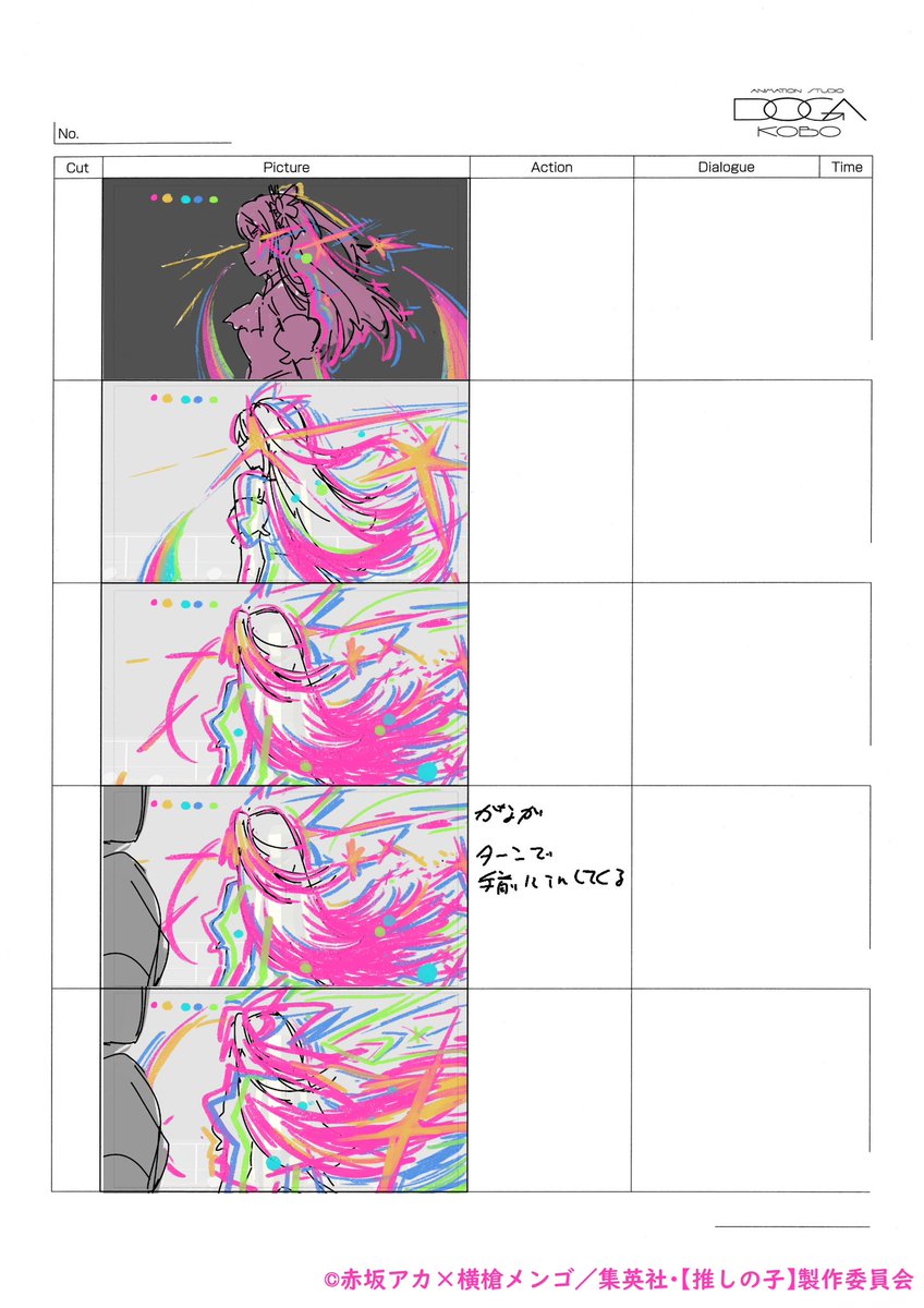 ライブパートコンテ演出やりました!新B小町の輝きをどう表現するか、悩みの日々でしたが、たくさんのスタッフの尽力により、最大限のアンサーを出せたと思います!感動するライブが描けたと自負しています!これが、我々アニメスタッフが皆さんに自信を持ってお送りする究極のアイドル達!#推しの子