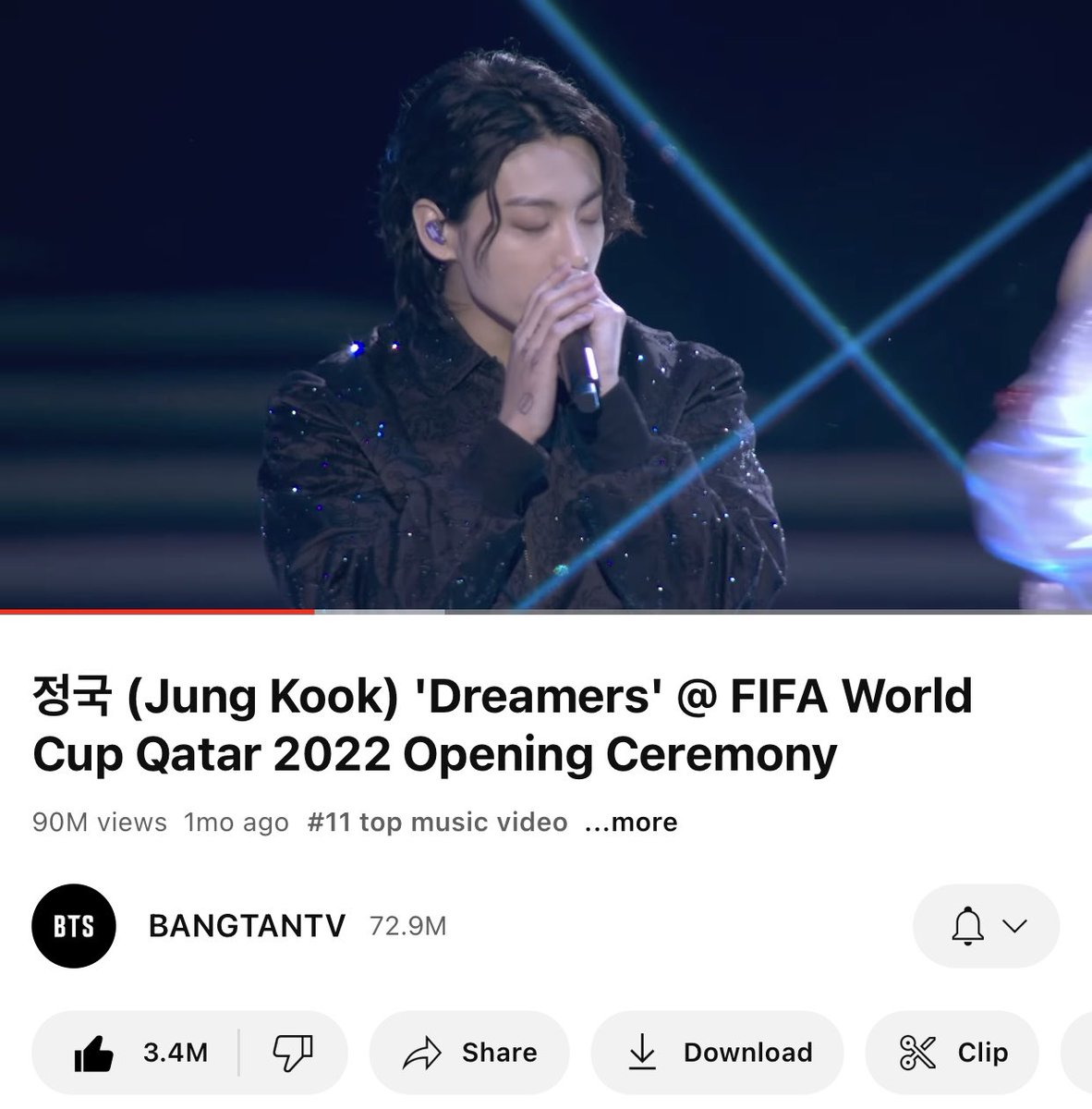 Jungkook’s “Dreamers” performance video on BANGTANTV is about 7.7M views away from reaching 100M views. Can we work more to improve the stream increase? 🤗
