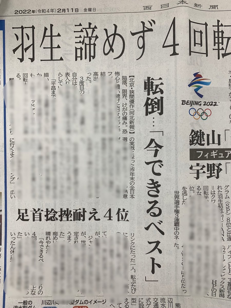 本日の一面に掲載された記事です。挑戦こそが、#羽生結弦 選手の本領。震災後、その姿を見て、人々は勇気づけられました。勝ち負けよりもまずは羽生選手の夢が叶ってほしいと、東北のファンの多くが願っているはずです。 twitter.com/kahoku_shimpo/…
