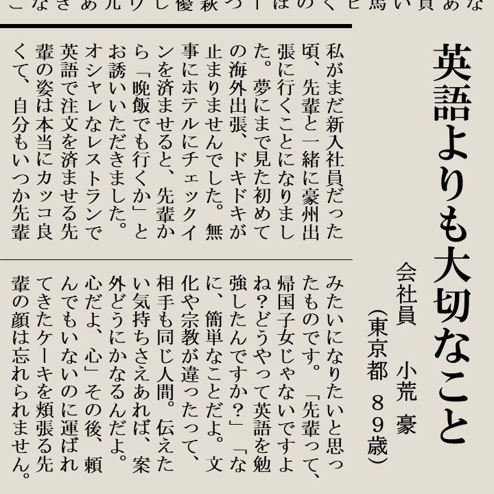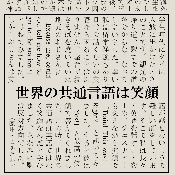 豪州で働き始めた日、英語に自信がない自分に同僚がかけてくれた言葉が忘れられない。「お前の英語が下手だなんて誰も思ってないぞ。俺は英語しか話せないから、頑張って外国語を身につけたお前を尊敬してる。聞き取れなかったら俺らのせいだからお前は何も気にせず話せ。」この言葉のお陰で今がある。