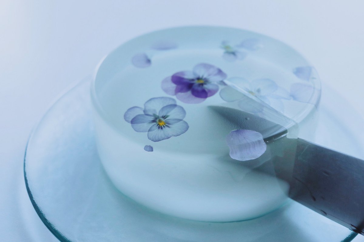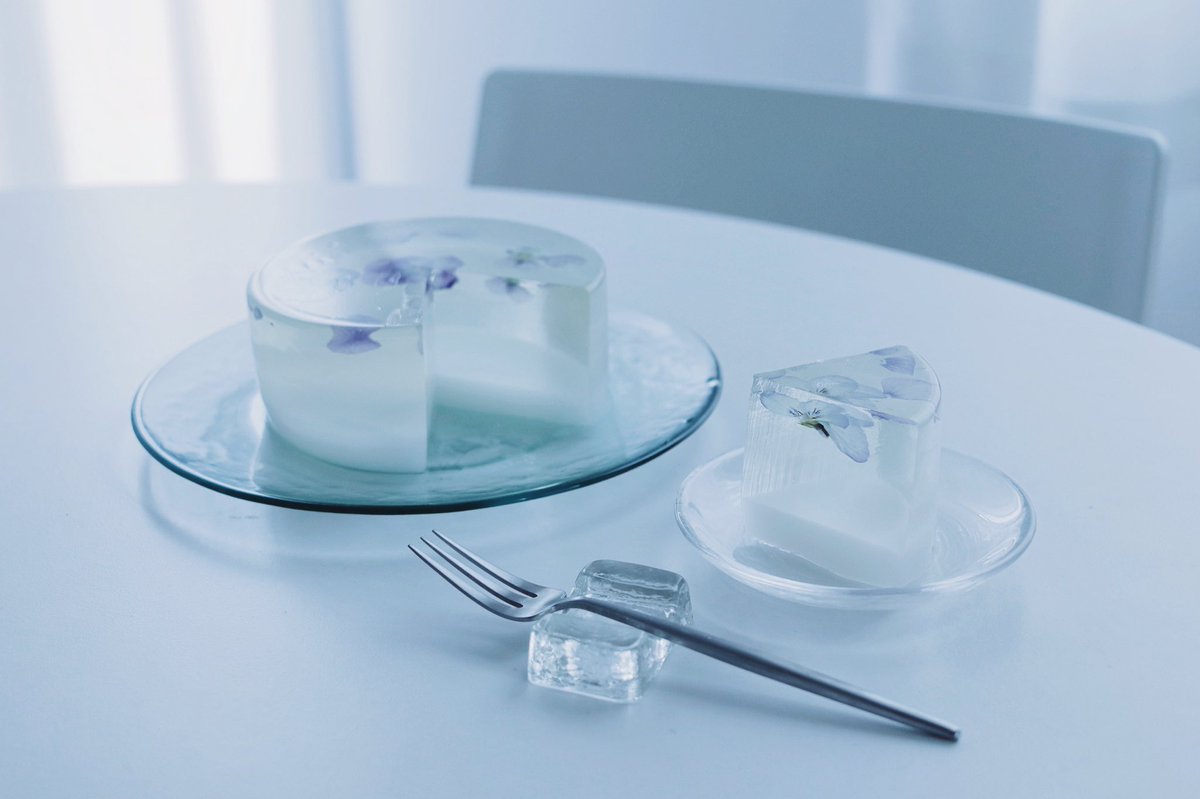 白に溶け込む。 食べられるお花のゼリーケーキ。