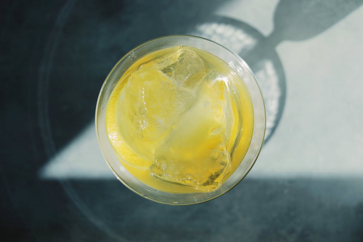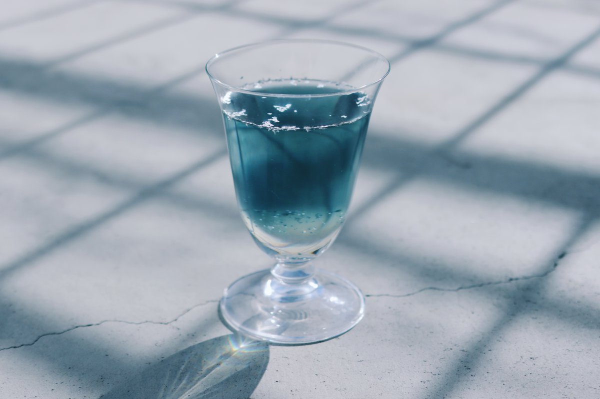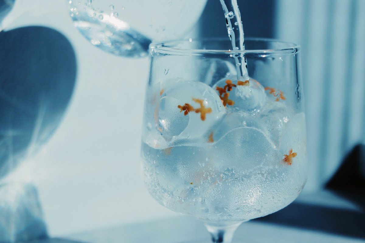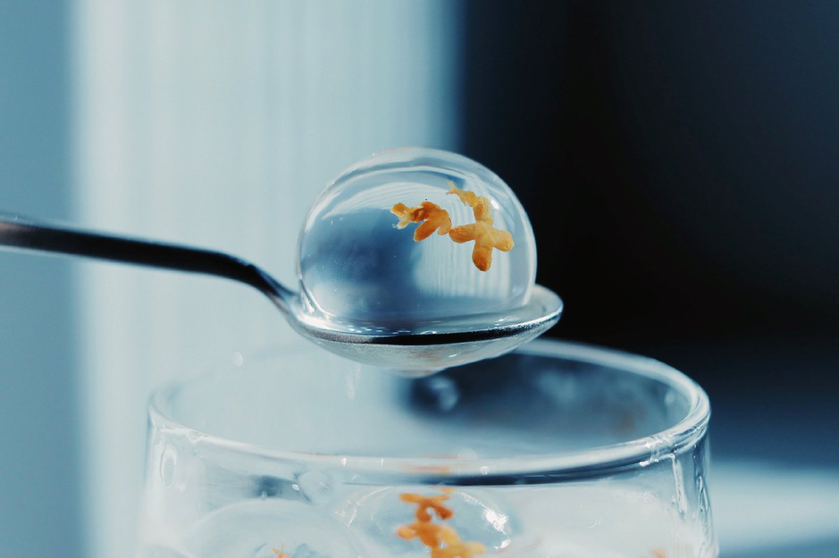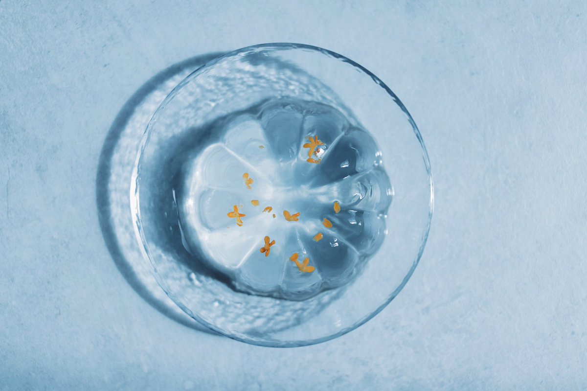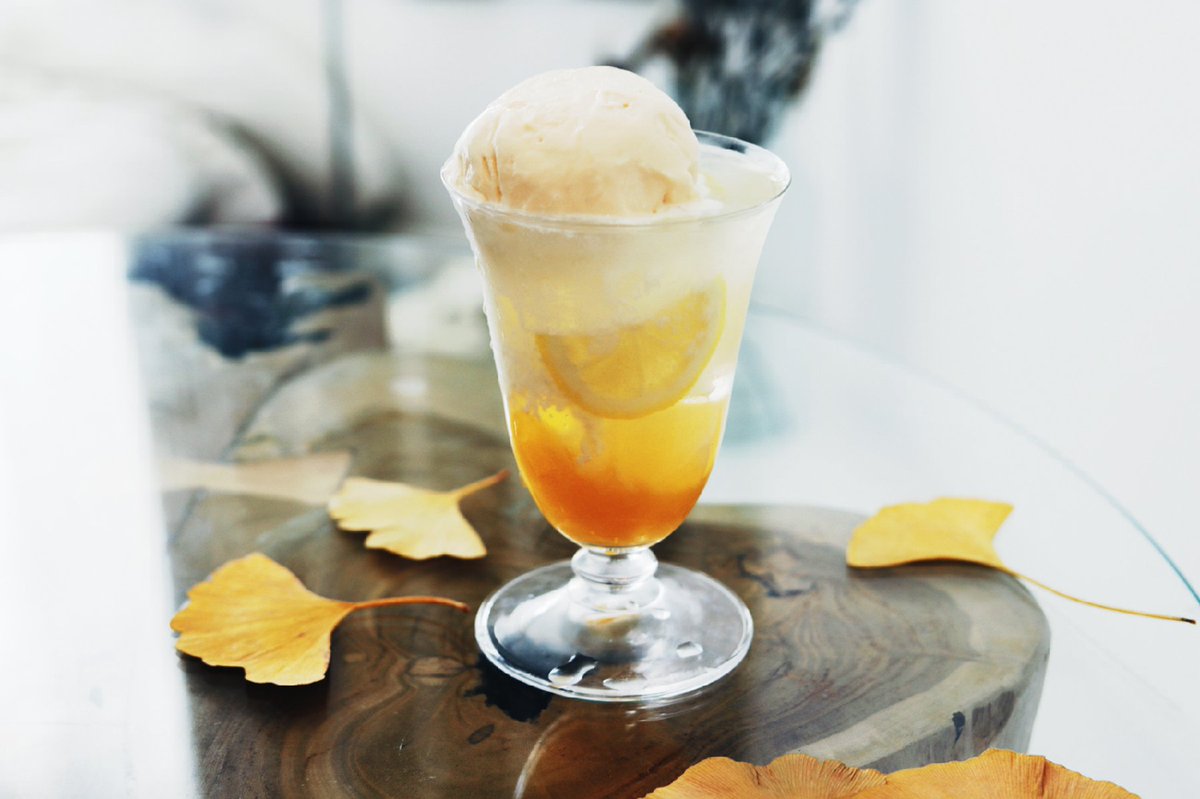 透明な落ち葉のアメを添えた キンモクセイのソーダ。