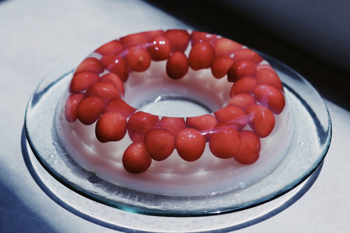 3. 製氷丸型にシャインマスカットと粗熱をとった(2)を流し込み冷蔵庫で固まるまで冷やす。