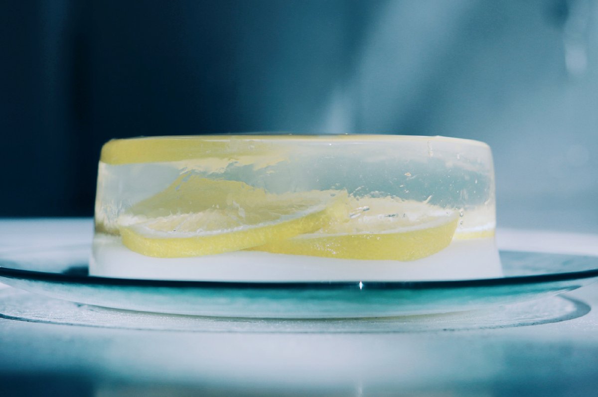 シロップ漬けのレモンを入れた 白ワインとカルピスのゼリー