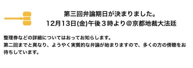 抽選や手荷物検査などで法廷に入るのに時間がかかることが予想されますため、傍聴に来てくださる方は、【9時30分】ごろには京都地裁にお越しください❗️