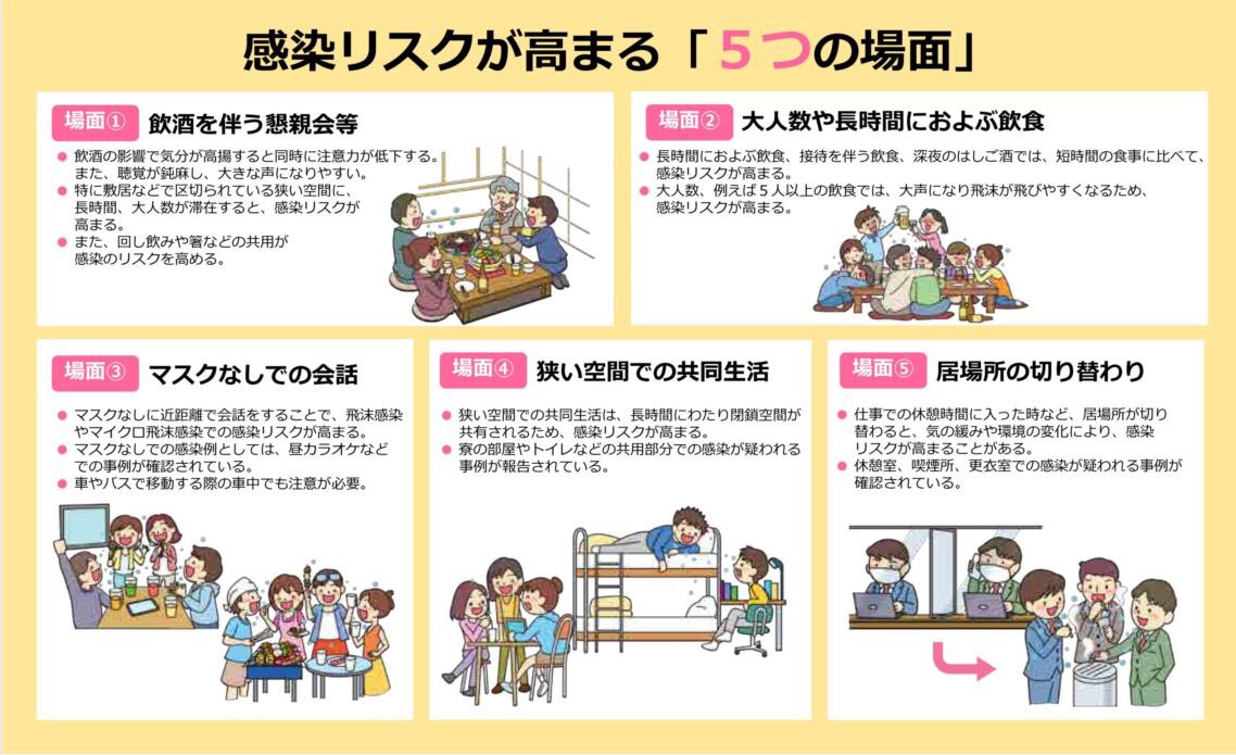 手洗い、マスク、3密や5つの場面の回避を確実にしていきましょう