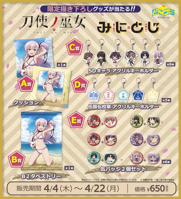 延期しておりました、オンラインくじ『どこプラ』が4月4日(木)12時よりサービス開始いたします。第一弾「刀使ノ巫女」「みにとじ」グッズを発売!販売期間は4月4日(木)~4月22日(月)となります。