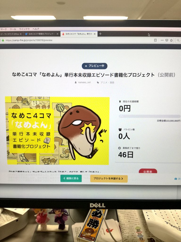 【祝プロジェクト成立】なめこ4コマ書籍化クラウドファンディング、おかげさまで開始当日3時間で目標金額300万円を突破しプロジェクト成立となりました!たくさんのご支援ありがとうございます!ストレッチゴールも準備していますので引き続き応援よろしくお願いします!!camp-fire.jp/projects/view/…
