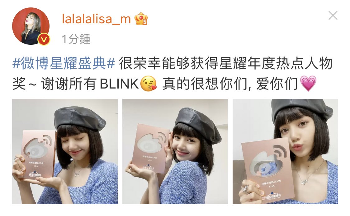 "So honoured to be awarded Weibo Starlight Popular Artist of the Year Award~ Thank you all BLINK😘 Really miss you so much, love you all💗" @BLACKPINK