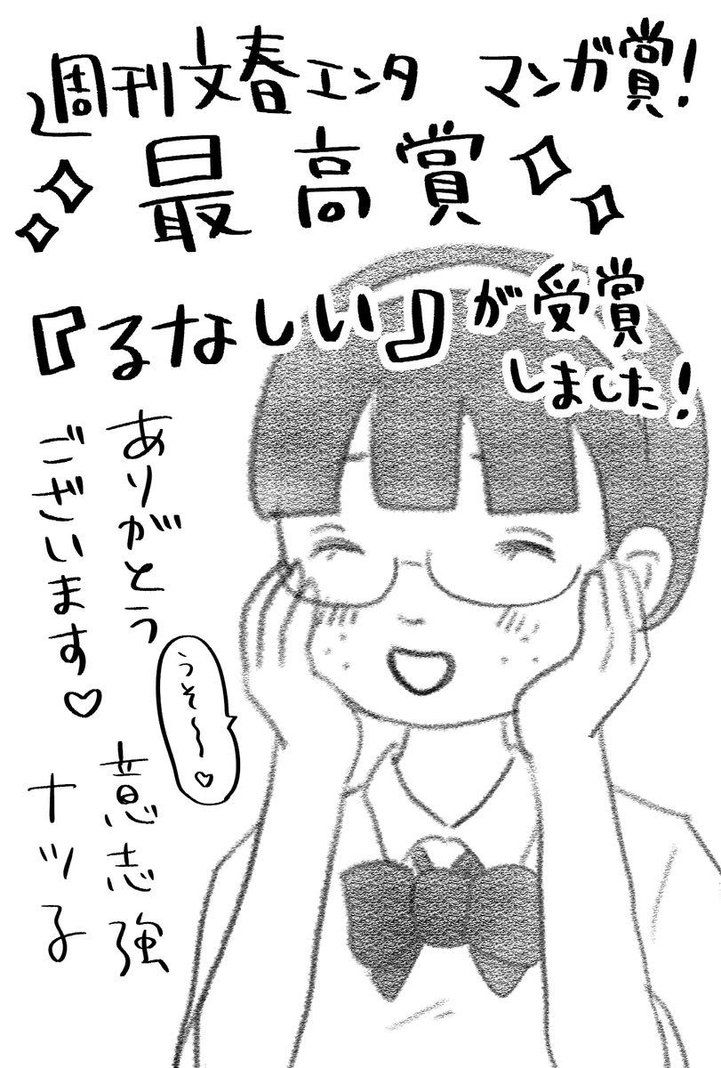 なんと、この度「るなしい」が、【週刊文春エンタ】マンガ賞で、最高賞を受賞しました!!🏅初めてこういう賞いただけた…もう、めちゃくちゃ嬉しいです😭ありがとうございます!!