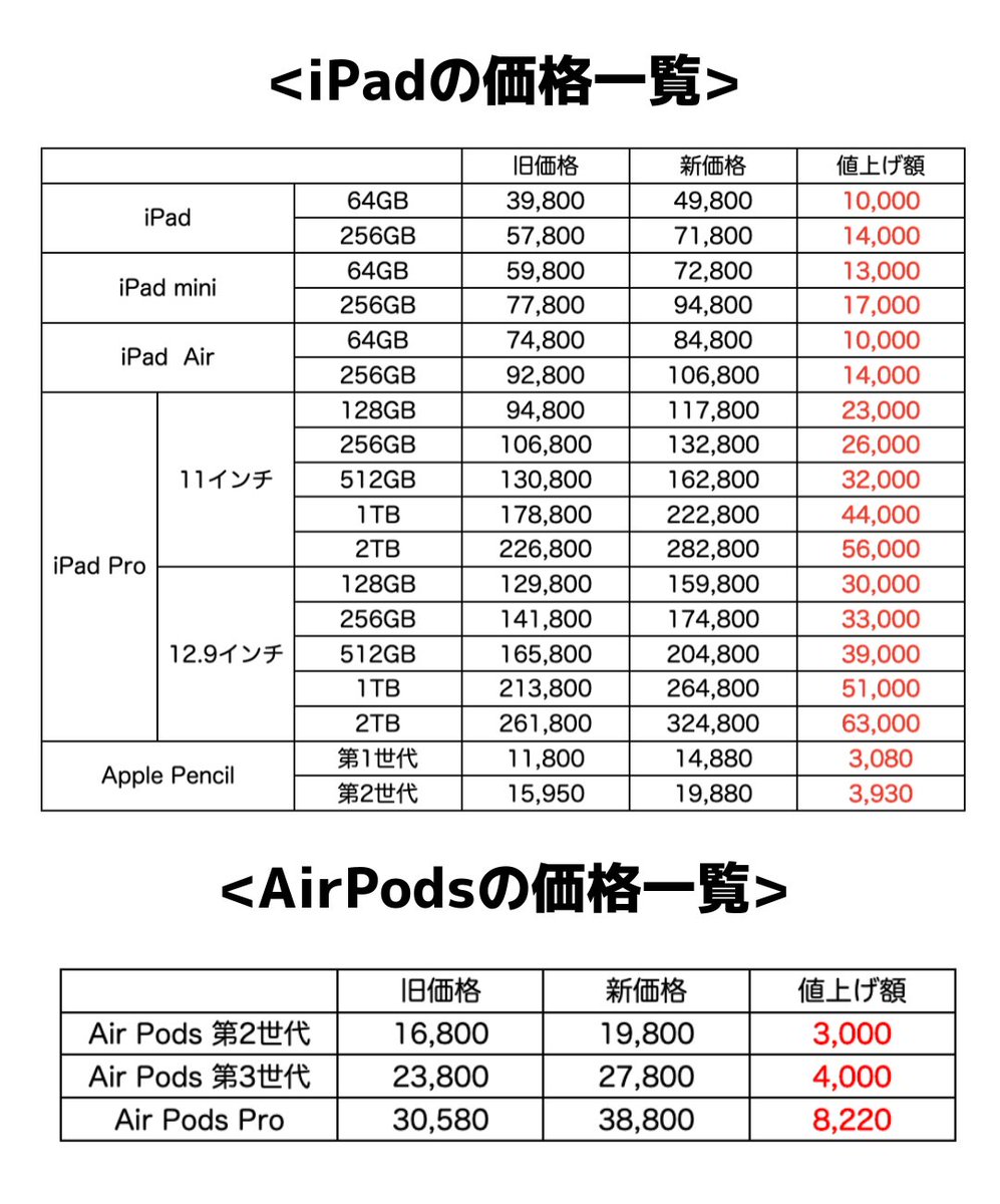 通常のiPadは10,000円〜14,000円値上げ、Air Pods Proも8,220円程値上げ。