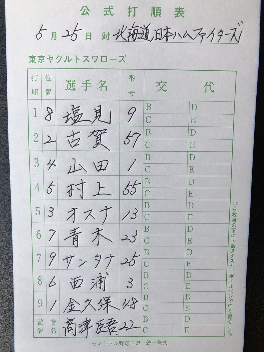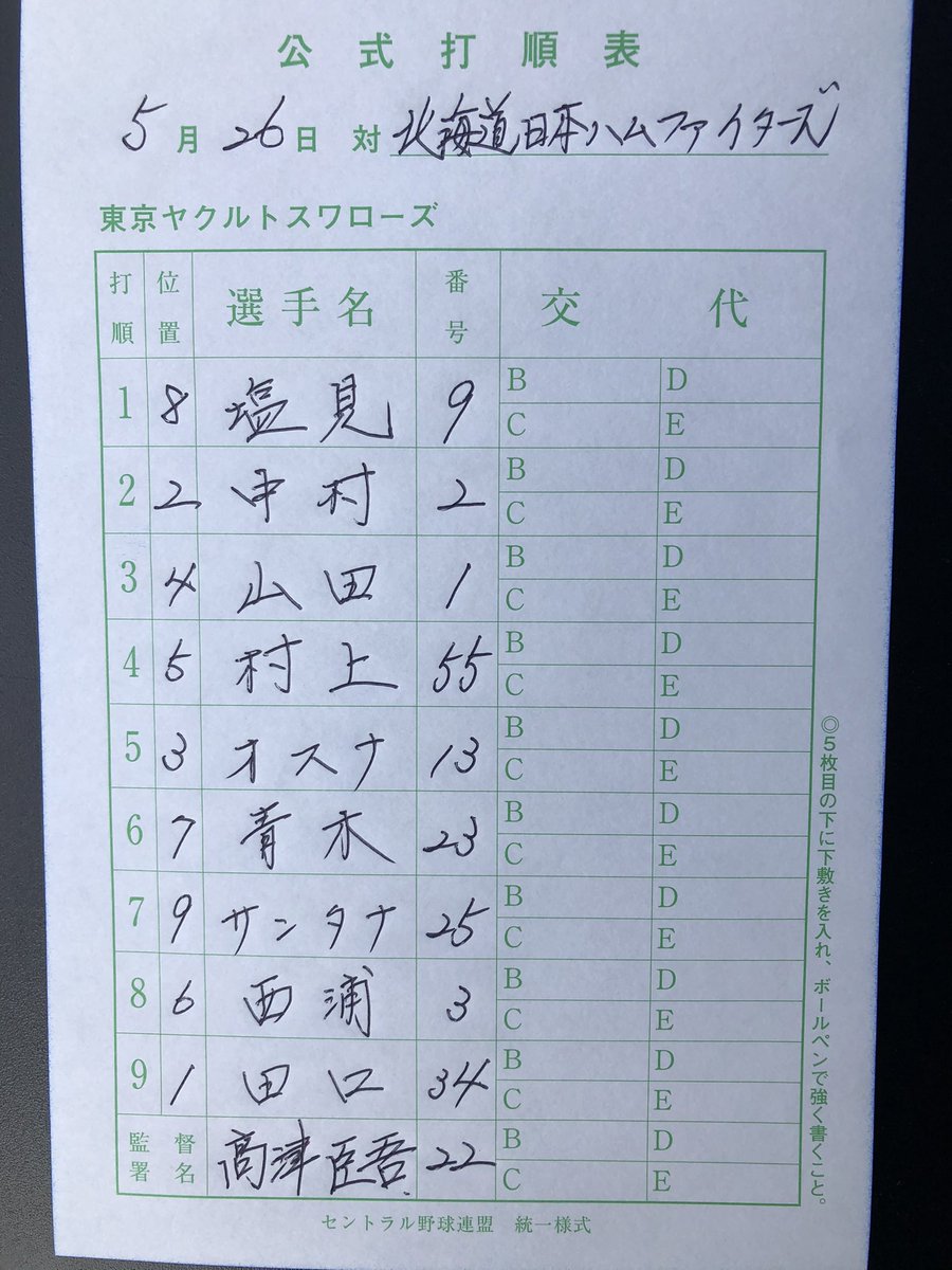 スワローズ本日のスタメン!