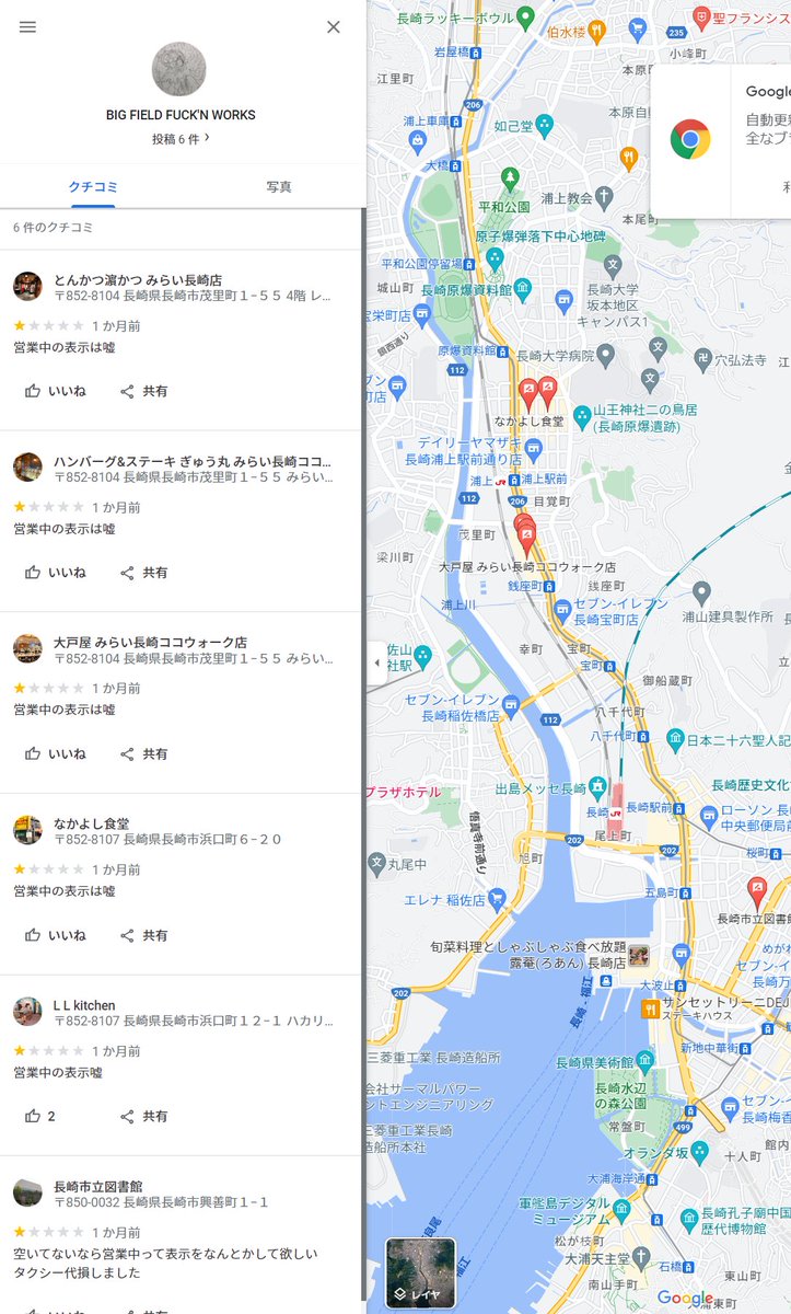 GoogleMapの口コミってキチガイと物凄いキチガイしかいないイメージなんですが(偏見スペースシャトル)、今日は「わざわざ台風の日に図書館と飲食店にいって営業中は嘘!タクシー代損した!」と騒ぐ変な生き物を発見しました。はやく無人島とかで殺処分されてほしい。