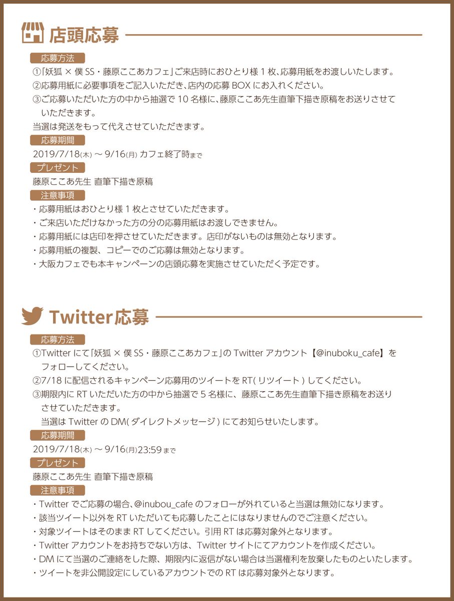 本キャンペーンは妖狐×僕SS・藤原ここあカフェ店頭と、カフェに来られない方のためにTwitterでも応募を受付いたします。