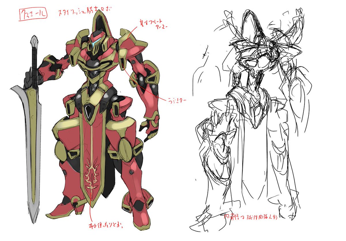 ではこの流れで、文庫で作ったエルネスティのデザイン画を…ナイツ&マジックは1巻でキャラ数名+メカ数体という普通のラノベに比べてはるかに多いデザイン量なのもあり、細部はかなりふわっとした状態で、あとでイラスト作る際に細部詰めてたり…#ナイツマ
