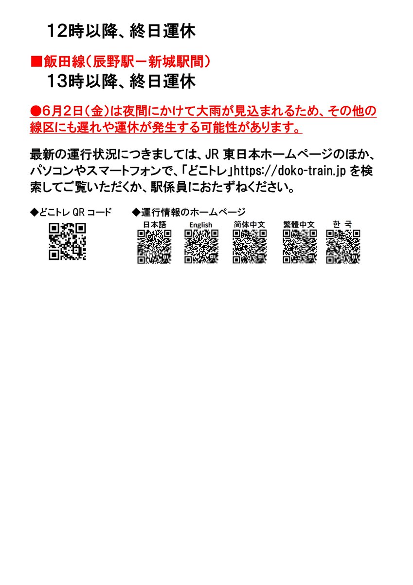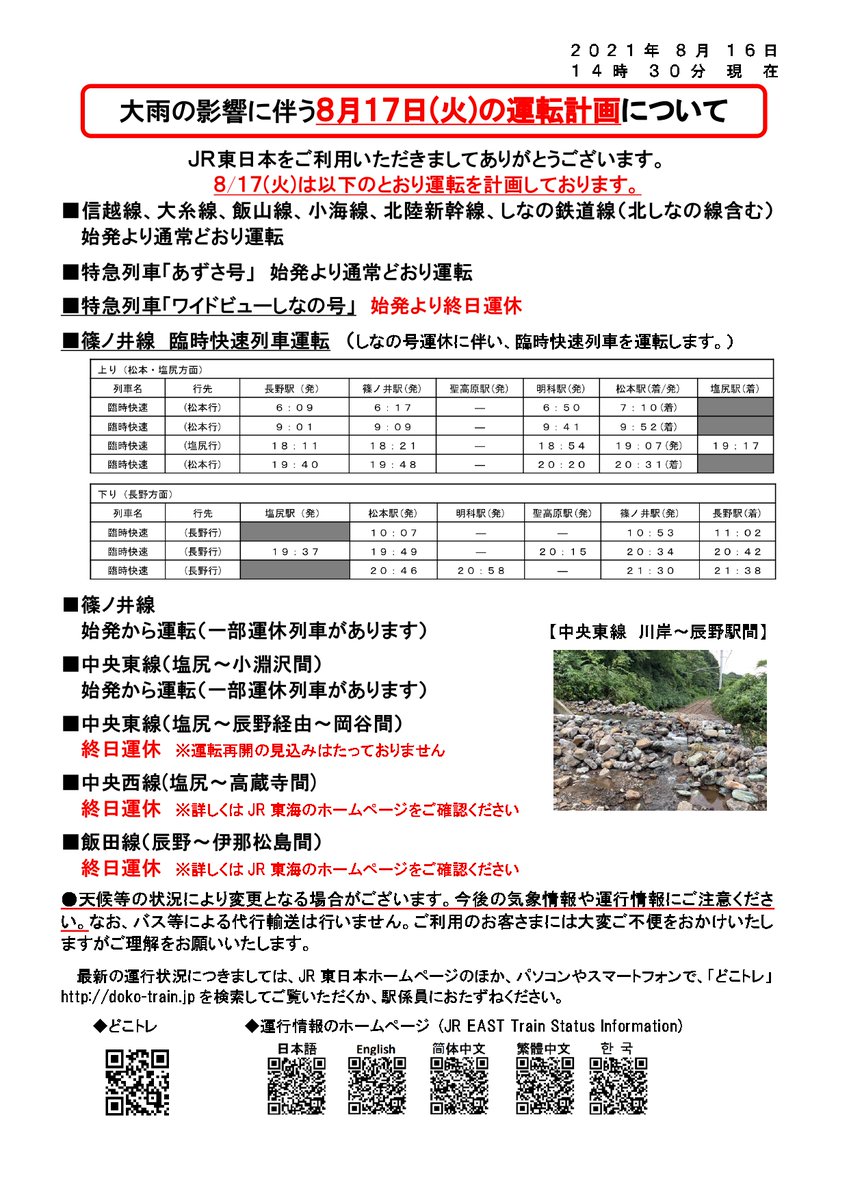 【8/17(火)運行情報】大雨の影響により、一部列車の運休・臨時列車の運転がございます。大変ご不便をおかけいたしますが、ご理解くださいますようお願い申し上げます。なお、最新の運行情報については、JR東日本HPや「どこトレ」でご確認ください。→doko-train.jp