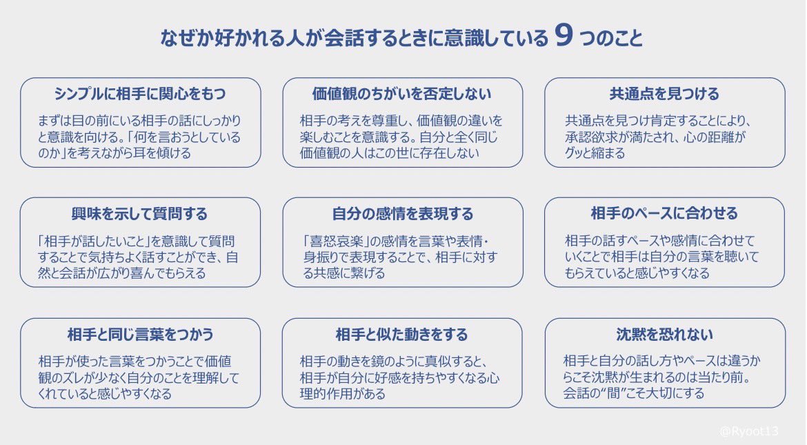 なぜか好かれる人は会議で意見する前に「先ほど〇〇さんが仰ったこと、凄く大事だと思っていて…」を添えます。人は本能的に"自分は重要な存在だと思われたい欲求"がある。『相手の名前+肯定』を添えるとその後に続く自分の意見にグッと耳を傾けてくれます。固ツイで今日からの会議は無双できます。